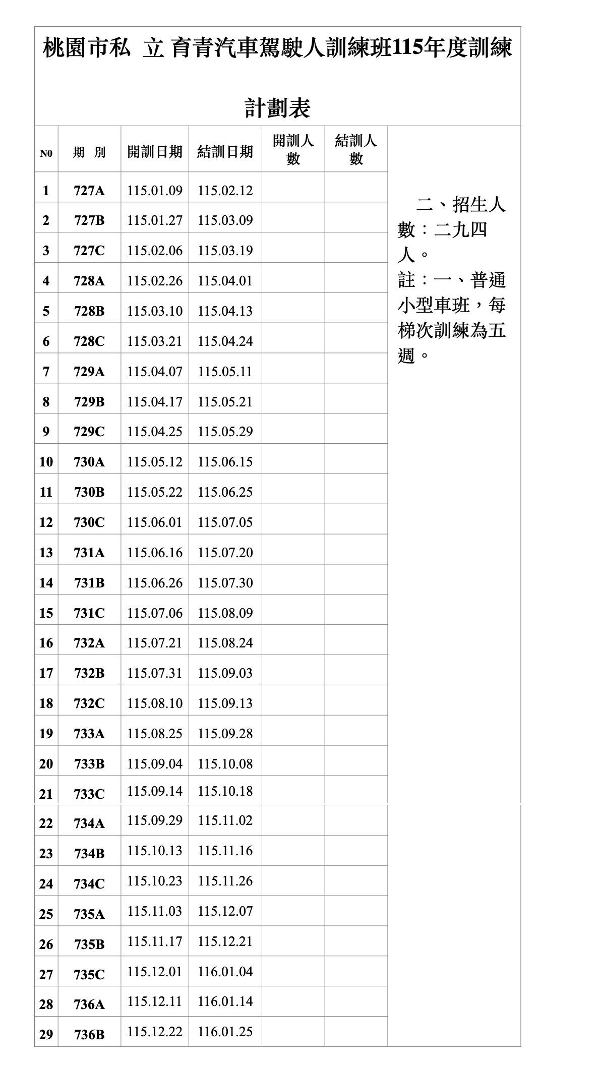 3. 普通自用小客車班手、自排車種*訓練課程,五週結訓,結訓後隨即配合監理站安排考期。